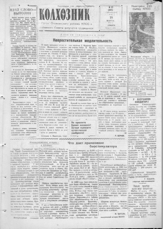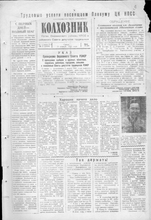 1961 год стал для Советского Союза, и для Олекминского района в частности, годом великих надежд и грандиозных свершений. Это был третий год семилетки (1959–1965), время активного строительства коммунизма, химизации народного хозяйства и подготовки к историческому XXII съезду КПСС. На страницах районной газеты «Колхозник» (орган Олекминского райкома КПСС и райсовета) вся эта эпоха нашла свое яркое и подробное отражение.