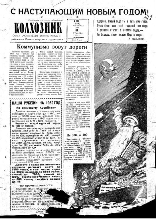 В последнем номере года (31 декабря 1961 г.) газета подводит итоги. Главным событием, безусловно, назван XXII съезд КПСС и принятие новой Программы партии. Промышленные предприятия района (СМУ-8, пищекомбинат) рапортуют о выполнении планов. Колхозы, хоть и с трудностями, выполнили план по продаже мяса и молока государству. Публикуются и планы на 1962 год: надоить по 1550 кг молока на корову, засеять 100 гектаров кукурузы.