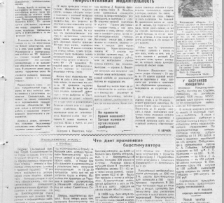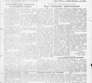 Кукурузная эпопея: В конце года, 20 декабря, звеньевод В. Шараборин из колхоза «Правда» делится амбициозными планами: вдохновившись опытом кубанского кукурузовода Лисичникова, он обещает получить по 300 центнеров зеленой массы кукурузы с гектара. Позже он повышает планку до 400 центнеров.