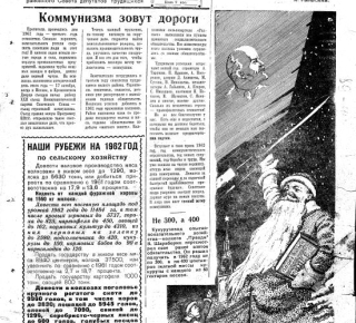 12 апреля 1961 года мир потрясла новость: советский человек Юрий Гагарин совершил первый в истории полет в космос. Газета «Колхозник» от 15 апреля вышла с огромными шапками, полностью посвятив номер этому событию. Было опубликовано обращение ЦК КПСС к народам мира и сообщение ТАСС. Но это был не единственный космический триумф года. Еще в номере от 4 февраля (№ 10) газета сообщала о запуске 4 февраля 1961 года тяжелого искусственного спутника Земли весом 6483 кг. Это событие подавалось как «яркий показатель роста» советской науки и техники.