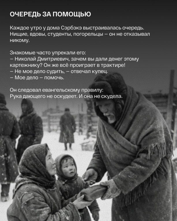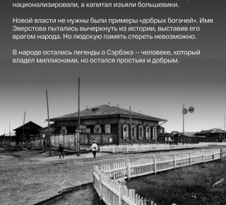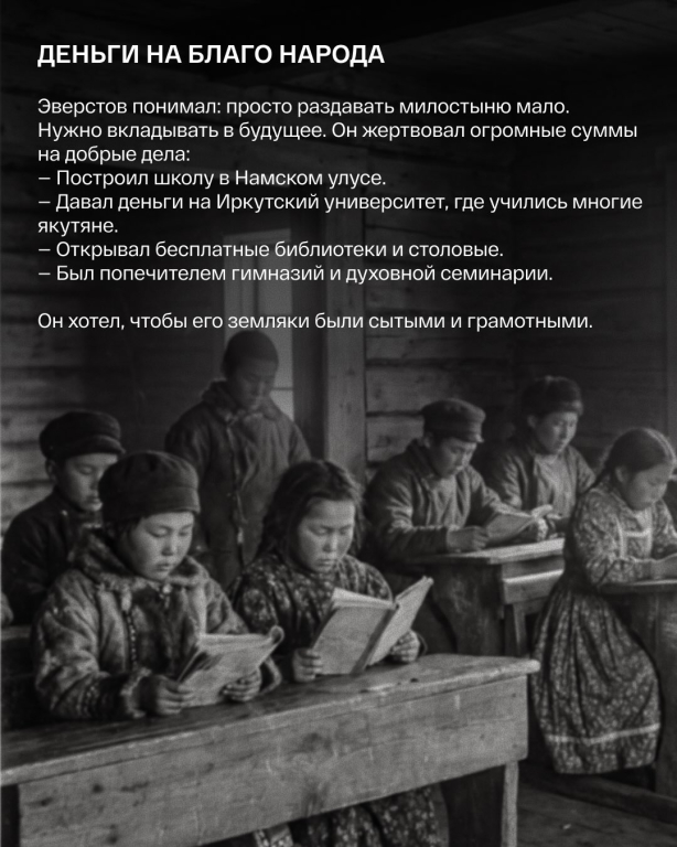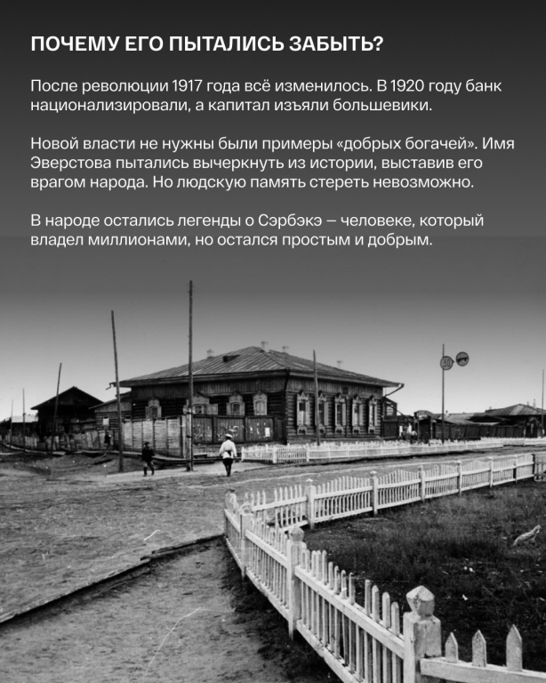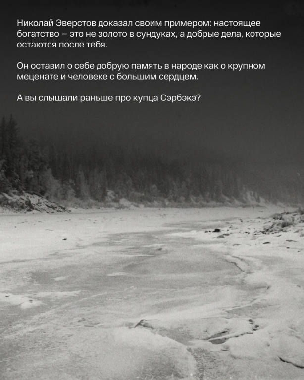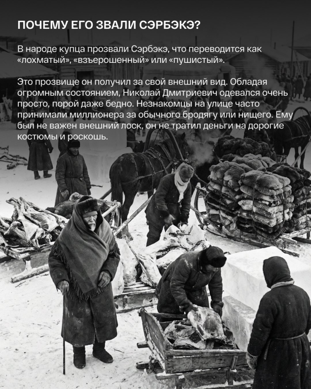 Николай Дмитриевич Эверстов, в народе известный как Сэрбэкэ. Он владел огромным капиталом, передовыми мельницами и складами в вечной мерзлоте. Но при этом ходил в старом сюртуке и выглядел как бедняк.
